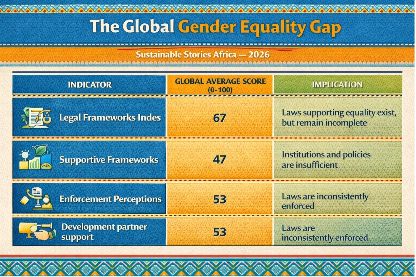 Supportive frameworks, such as childcare policies, access to justice, and enforcement institutions, score only 47, while enforcement perceptions score 53 globally.