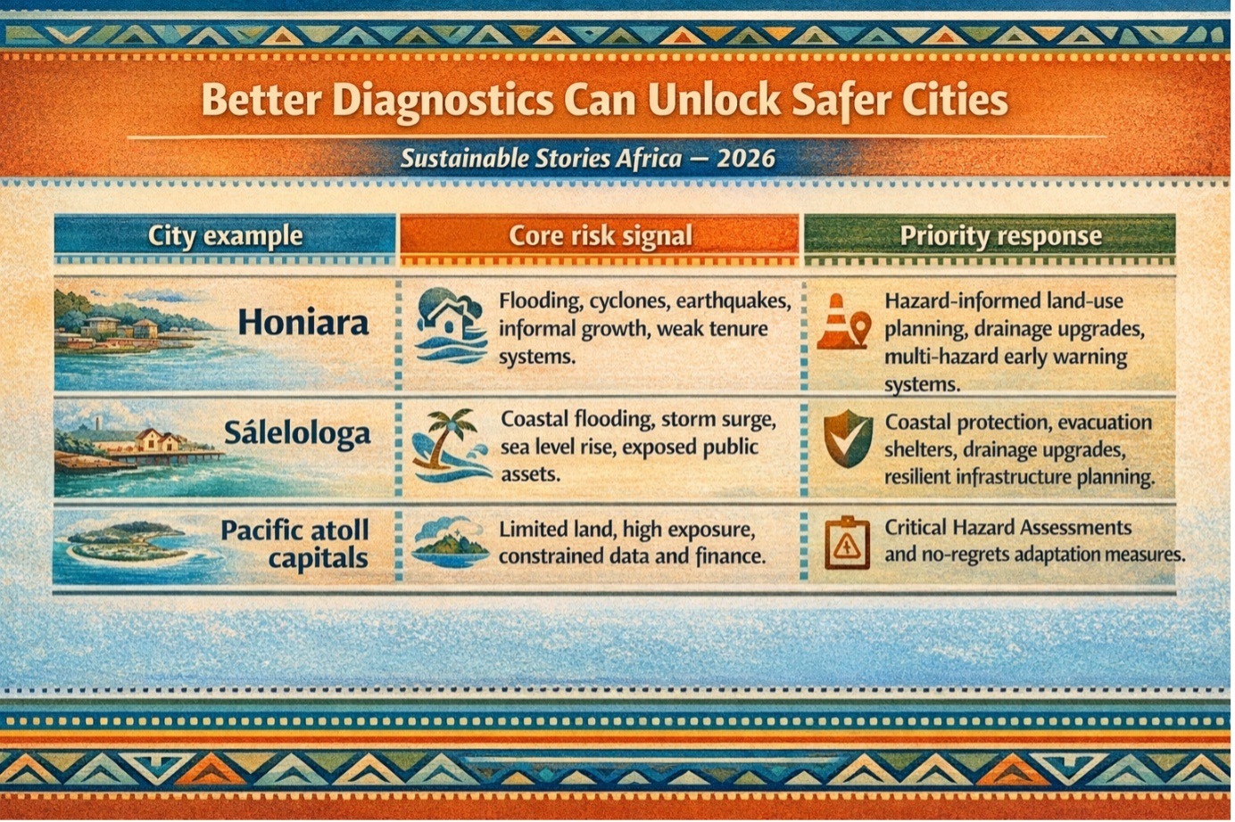 For African markets, the resonance is immediate. Coastal flooding, informal settlements, weak drainage, road-network fragility, land-tenure complexity and limited municipal finance are not Pacific-only problems.
