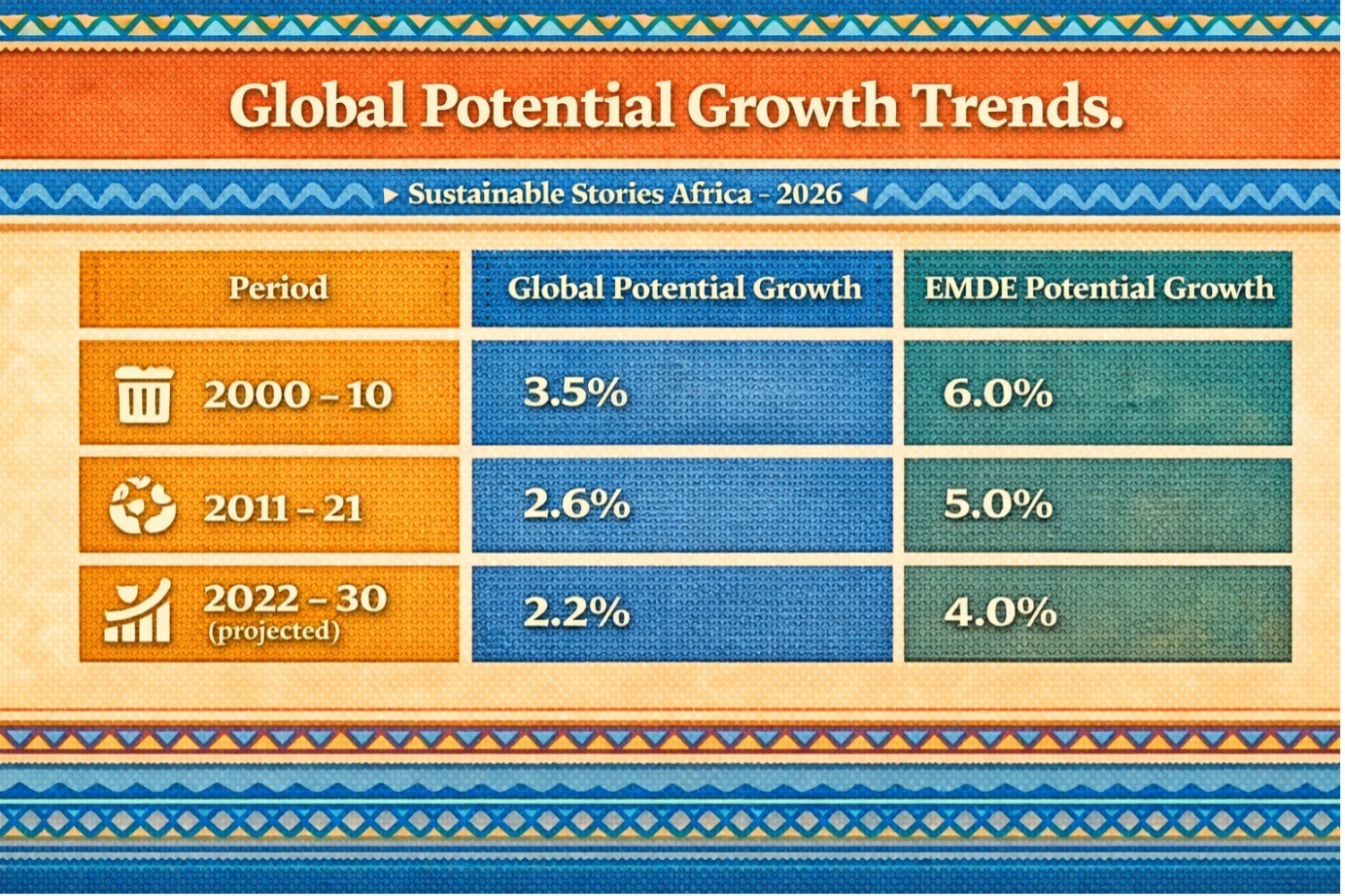 For emerging markets, especially across Africa, the imperative is sharper: slower potential growth constrains poverty reduction, debt repayment capacity and climate adaptation financing.