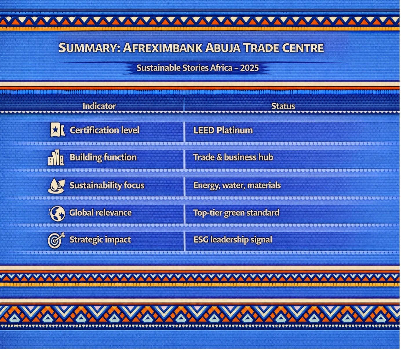 Afreximbank's Abuja African Trade Centre has achieved LEED Platinum certification, the highest global standard for green buildings, positioning the institution at the forefront of sustainable infrastructure development in Africa.