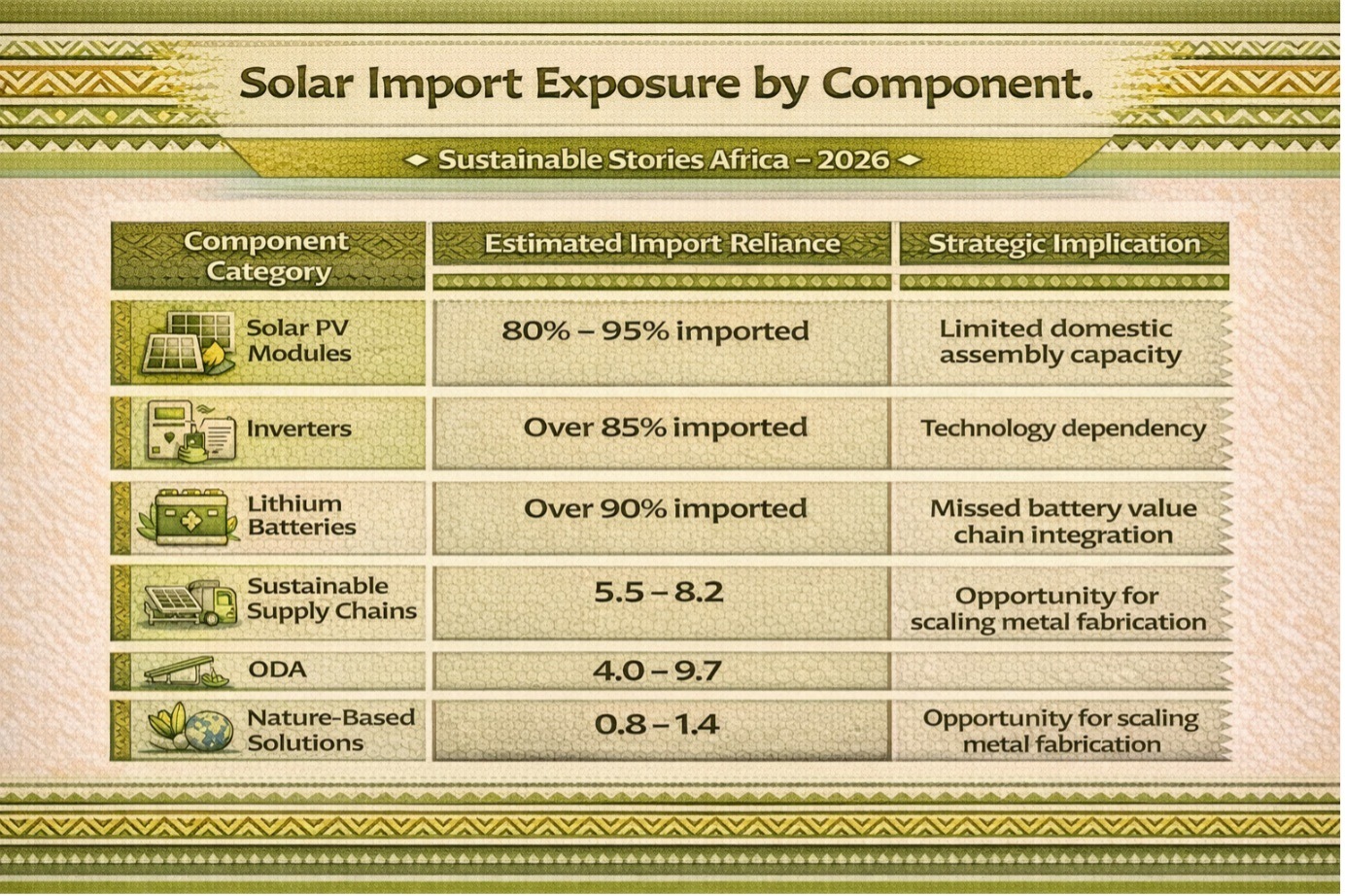 In several markets, solar equipment is one of the fastest-growing categories of solar-energy imports. Industry analysts estimate that more than 80–90% of solar modules installed across sub-Saharan Africa are imported, representing billions in annual outflows.
