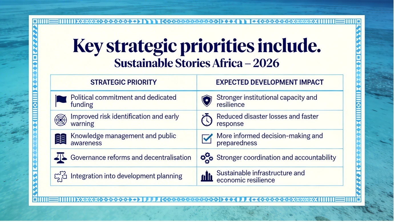 Africa’s disaster risk strategy prioritises institutional reform, governance strengthening, and integration of resilience into development planning.