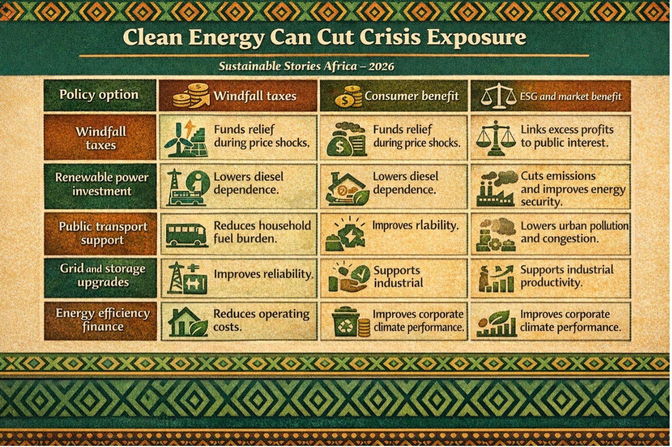 For African markets, the route is clear: reduce diesel dependence, expand reliable power, protect vulnerable households and finance transition assets that make economies less exposed to the next oil shock.