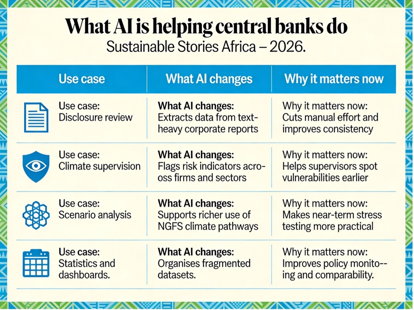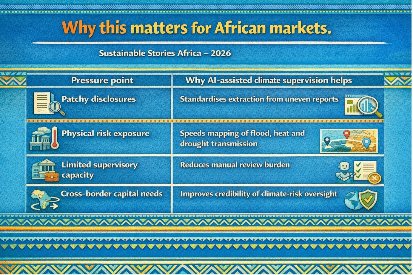 For African markets, the opportunity is clear: build climate data capacity, strengthen supervisory metrics and use AI carefully to close information gaps.
