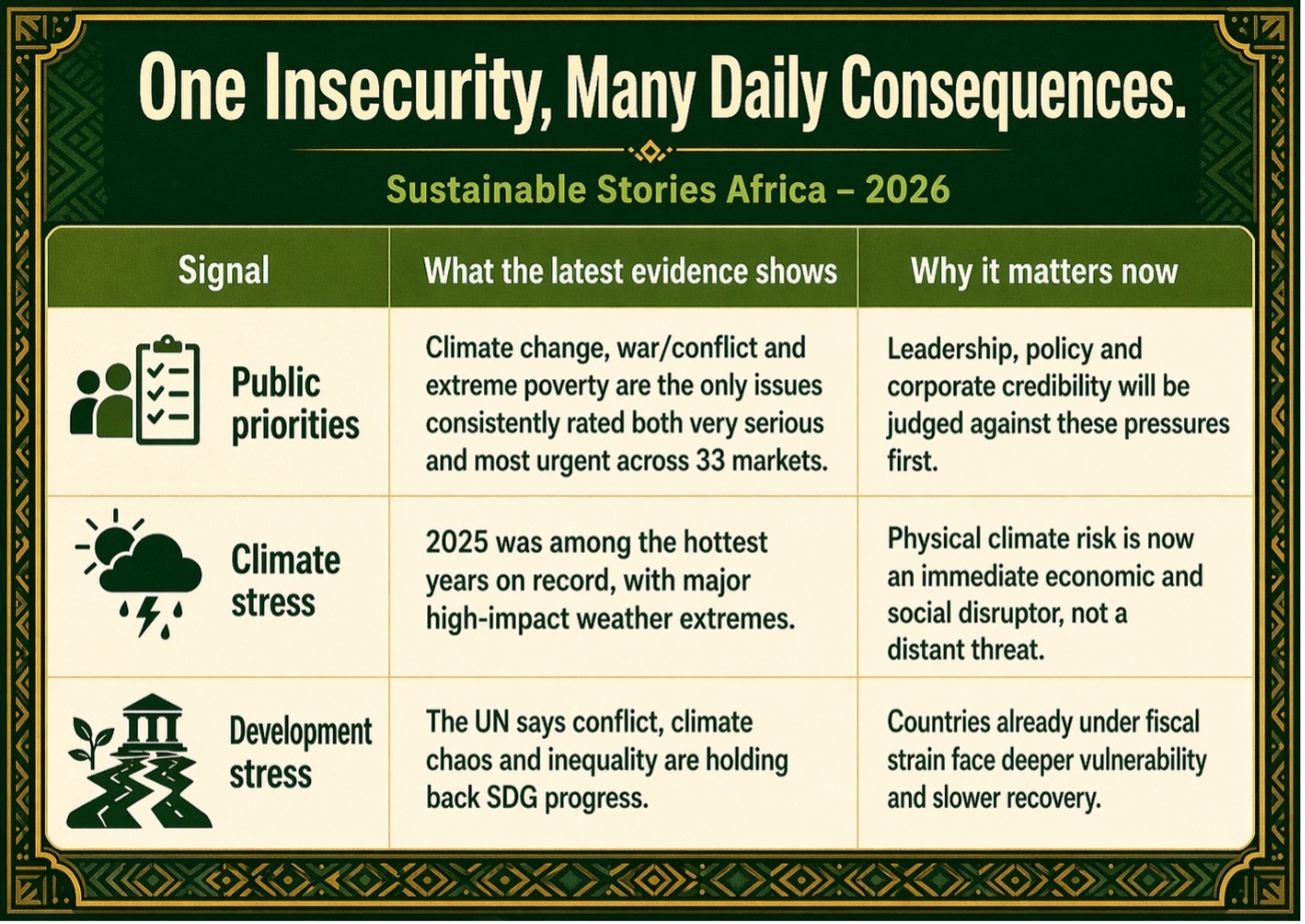 Citizens are reading climate shocks, insecurity and hardship as a single web of vulnerability that touches food prices, jobs, migration, health and trust in leadership. That makes this more than a perception story; it is a market and governance signal.