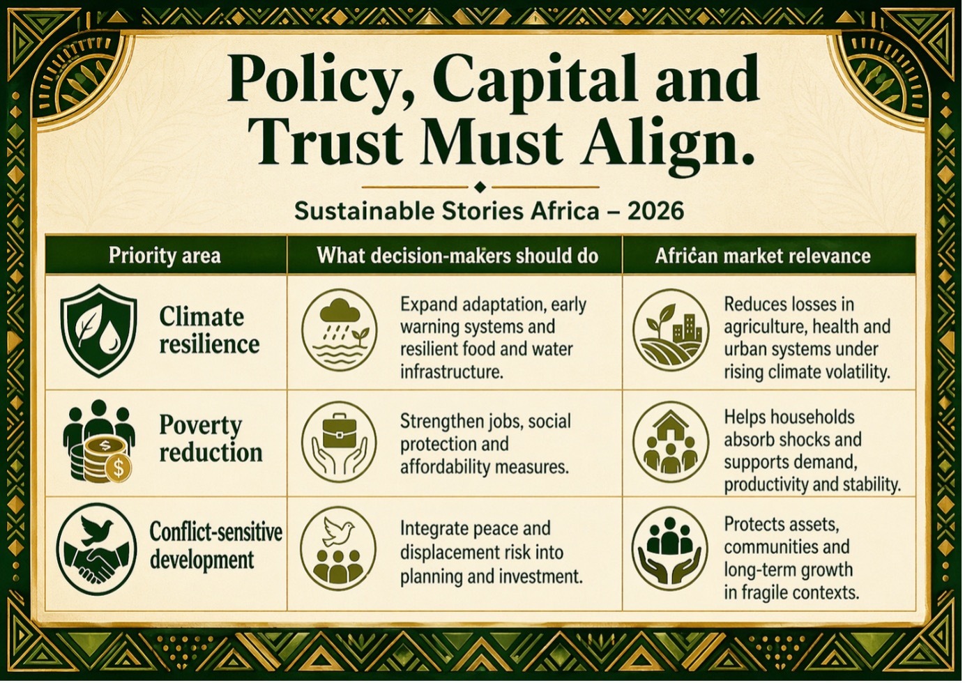 Anti-poverty measures can be tied to resilience, food systems and local jobs. Peacebuilding and governance reforms can be treated as investment conditions, not side conversations.