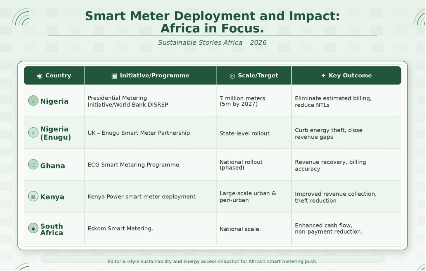 | Nigeria (Enugu) | UK – Enugu Smart Meter Partnership | State-level rollout | Curb energy theft, close revenue gaps |