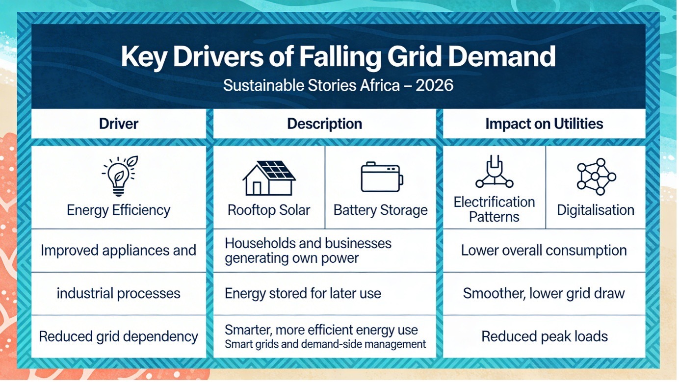 Energy efficiency improvements, rooftop solar adoption, battery storage, and changing consumption patterns are reducing reliance on centralised grids.