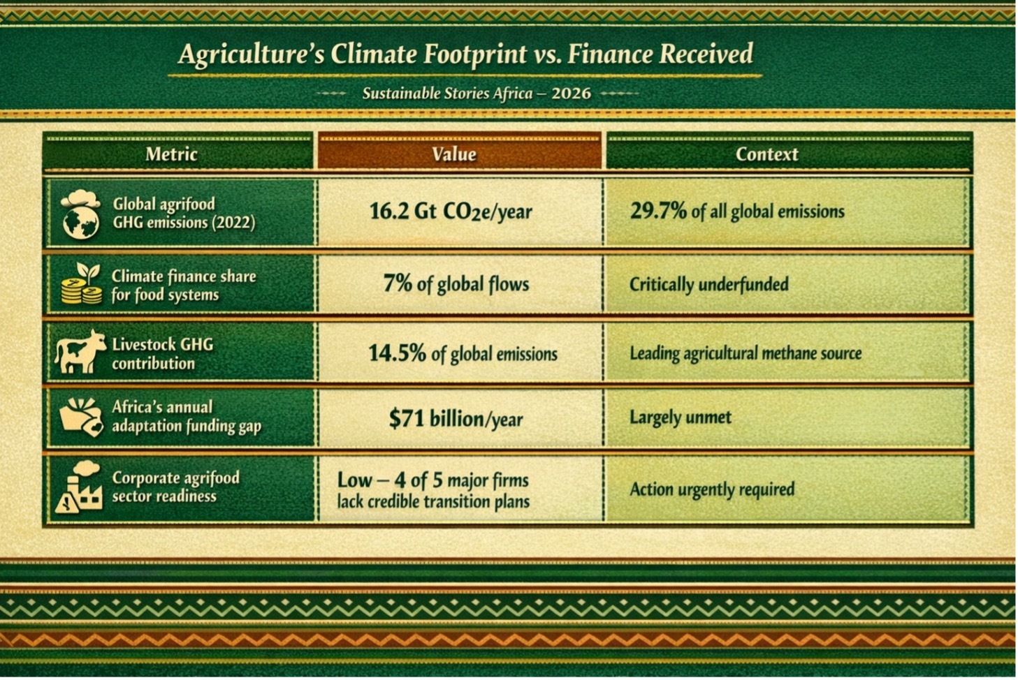 | Climate finance share for food systems | 7% of global flows | Critically underfunded |
