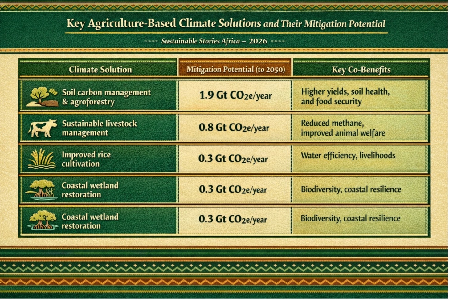 | Soil carbon management & agroforestry | 1.9 Gt CO2e/year | Higher yields, soil health, and food security |