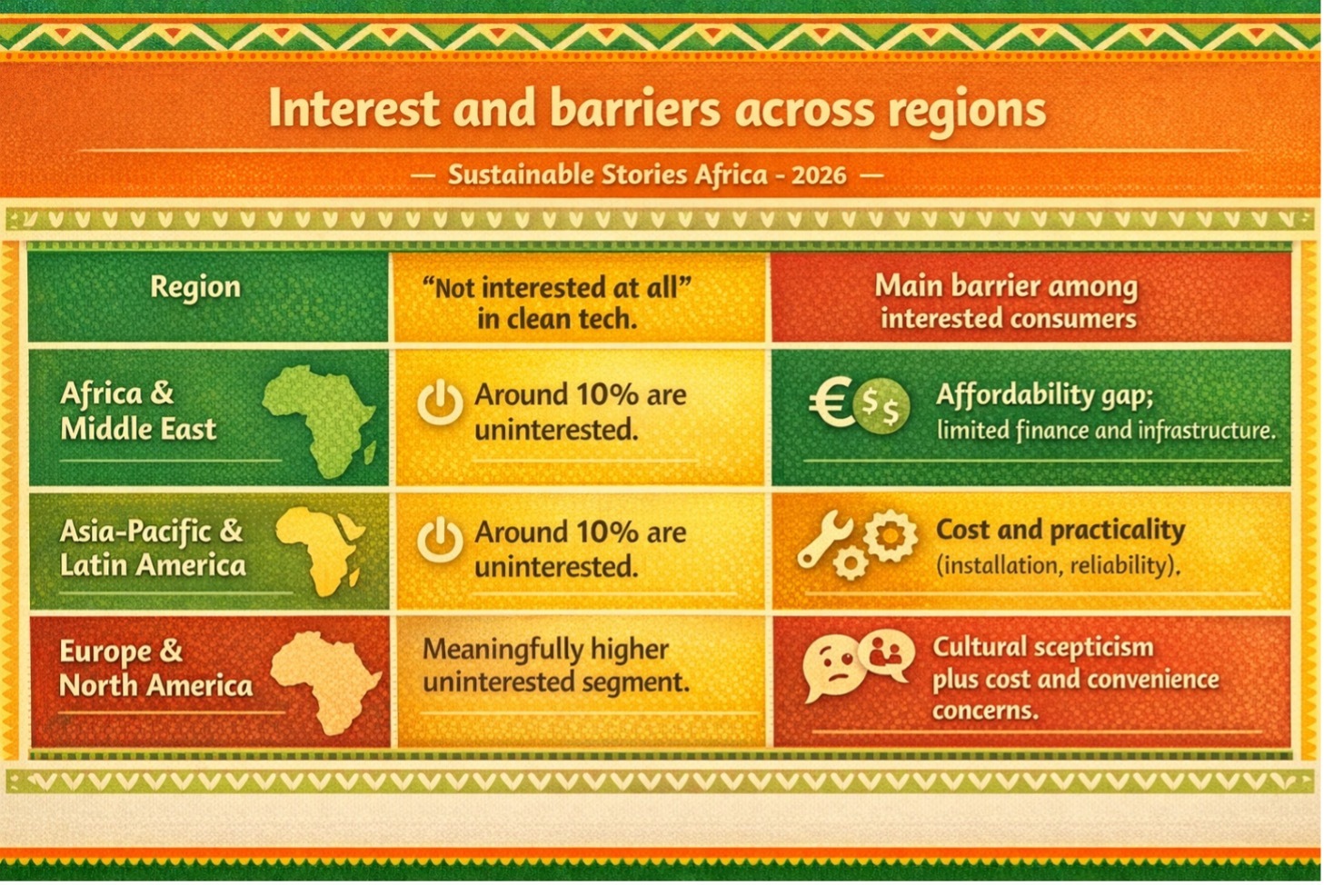 | Region | “Not interested at all” in clean tech. | Main barrier among interested consumers. |