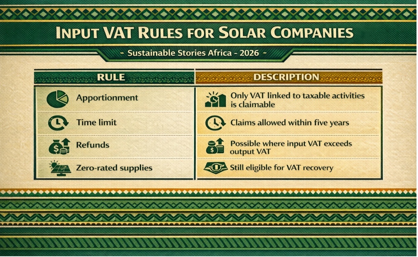 Solar companies selling zero-rated equipment can still recover VAT paid on business expenses such as vehicles, office equipment, and operational supplies.