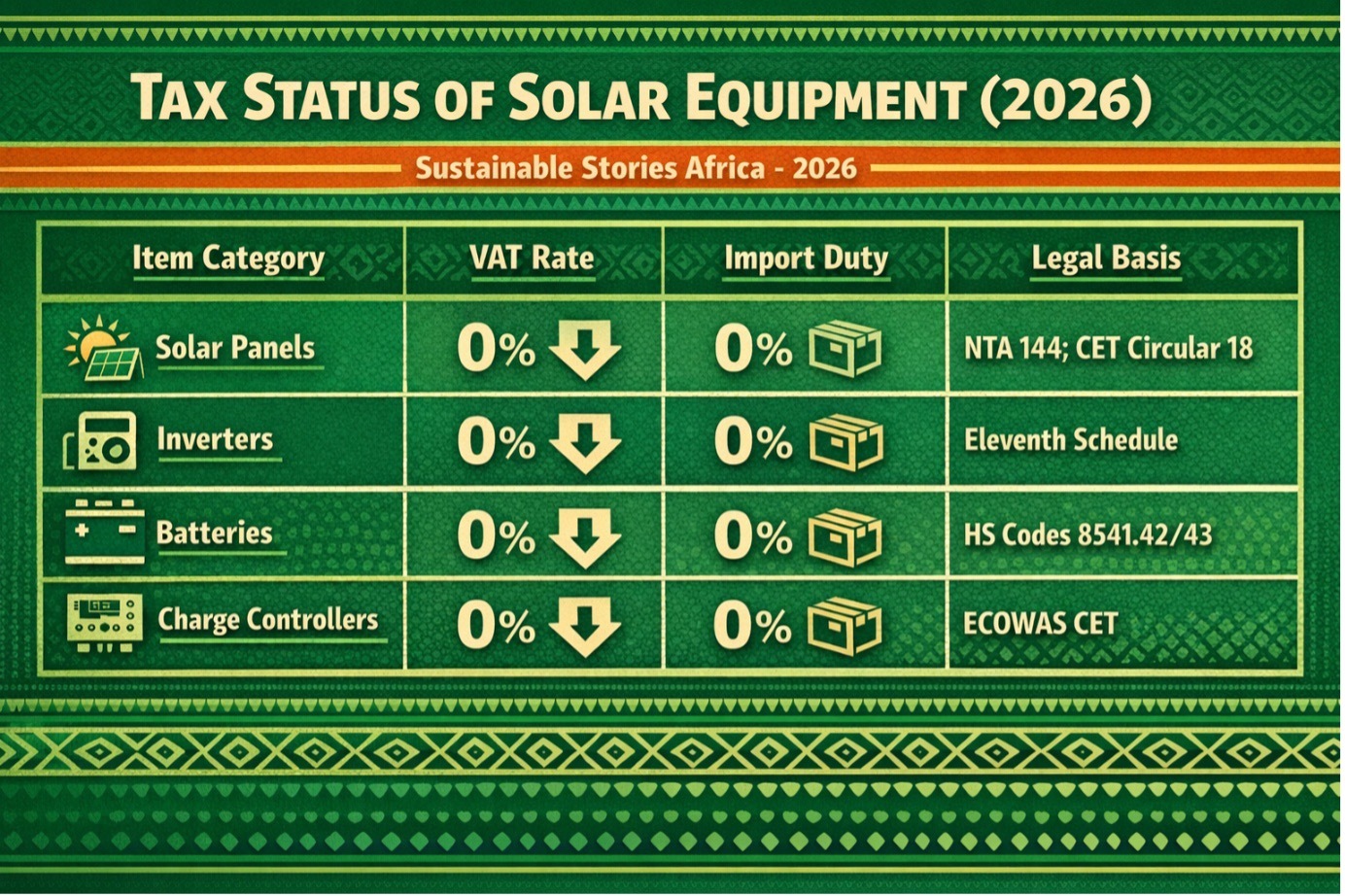 According to Samuel Attah, Finance Officer at Ceesolar, solar panels, inverters, batteries, and charge controllers remain zero-rated for VAT and exempt from import duties under Section 144 of the NTA and Nigeria Customs Circular T&T/2024/18.