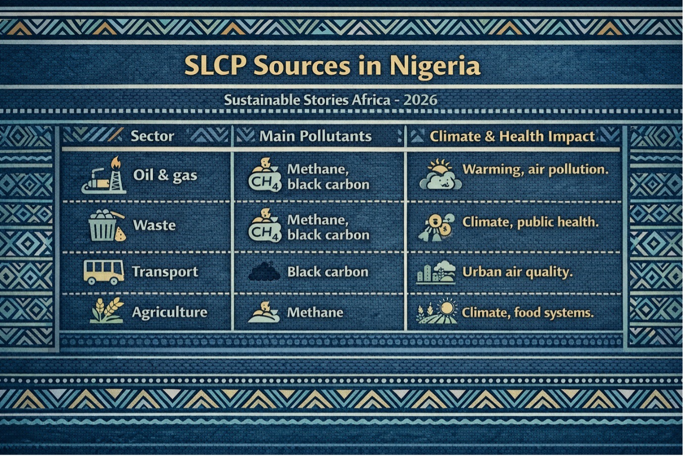 Short-lived climate pollutants are responsible for a large share of short-term warming and urban air pollution. In Nigeria, major sources include: