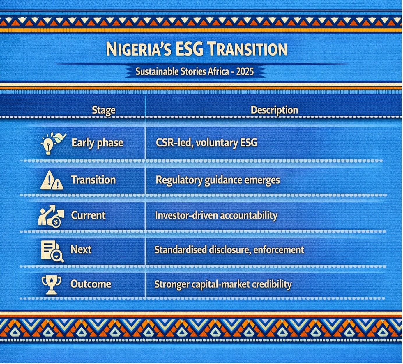 Nigeria's ESG evolution, which we term "From ESG Awareness to Market Discipline," is entering a more structured phase driven by regulation, investor scrutiny and capital-market realities. The focus is shifting from narrative sustainability to measurable governance, credible data and risk-aligned disclosure.