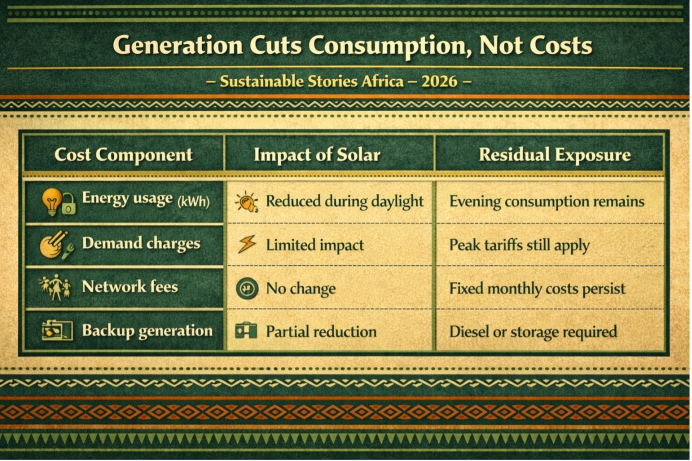 Energy experts say solar generation, while critical, does not eliminate grid charges, demand tariffs or backup fuel costs.