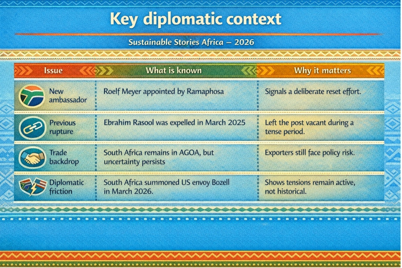 Pretoria’s immediate priority is to convert Meyer’s appointment into a steady diplomatic engagement that protects trade, lowers political temperature and restores credibility in one of its most important bilateral relationships.