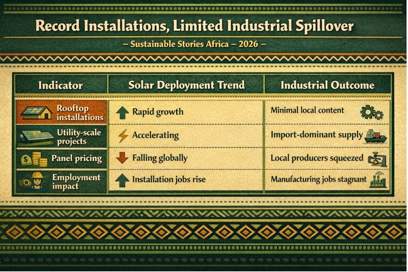 South Africa has installed gigawatts of solar capacity in response to persistent electricity shortages; however, the expansion has failed to catalyse a robust local manufacturing base.