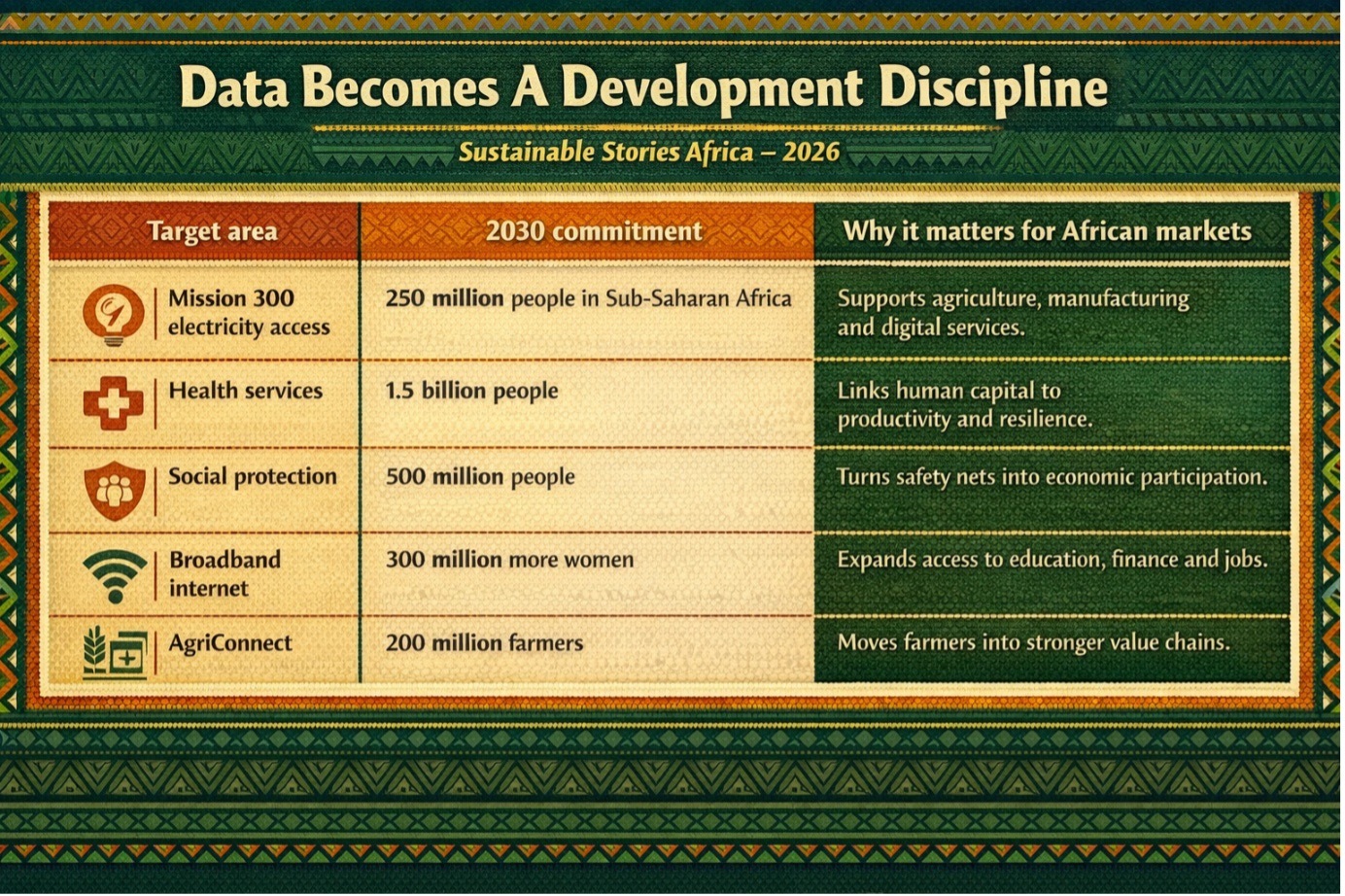 The Target Map sets nine headline ambitions for 2030, including health services for 1.5 billion people, social protection for 500 million poor and vulnerable people, broadband access for 300 million more women, electricity access for 250 million people in Sub-Saharan Africa, and value-chain support for 200 million farmers.