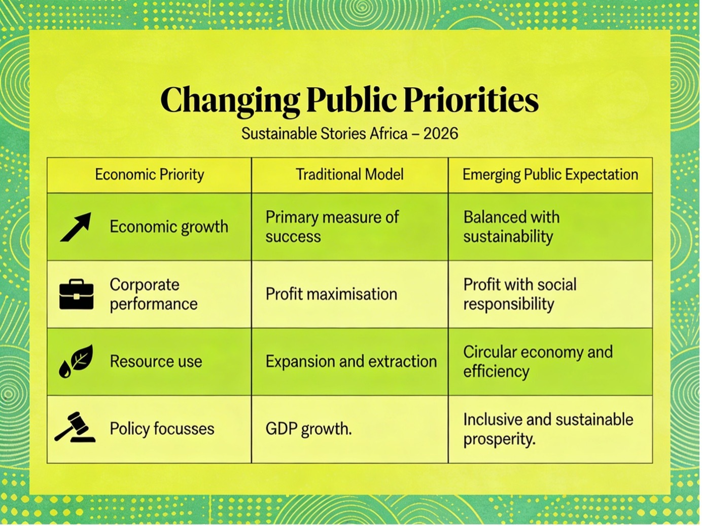 Economic Priority | Traditional Model | Emerging Public Expectation |