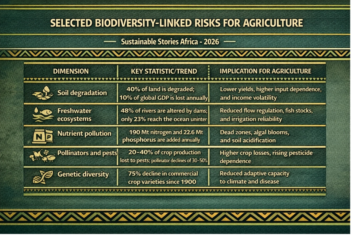 The report highlights four main channels through which prevailing agricultural models degrade biodiversity and the ecosystem services that support food production: land and soil management, water use, pollution and genetic erosion. These pressures interact, creating compound risks to yields and livelihoods.
