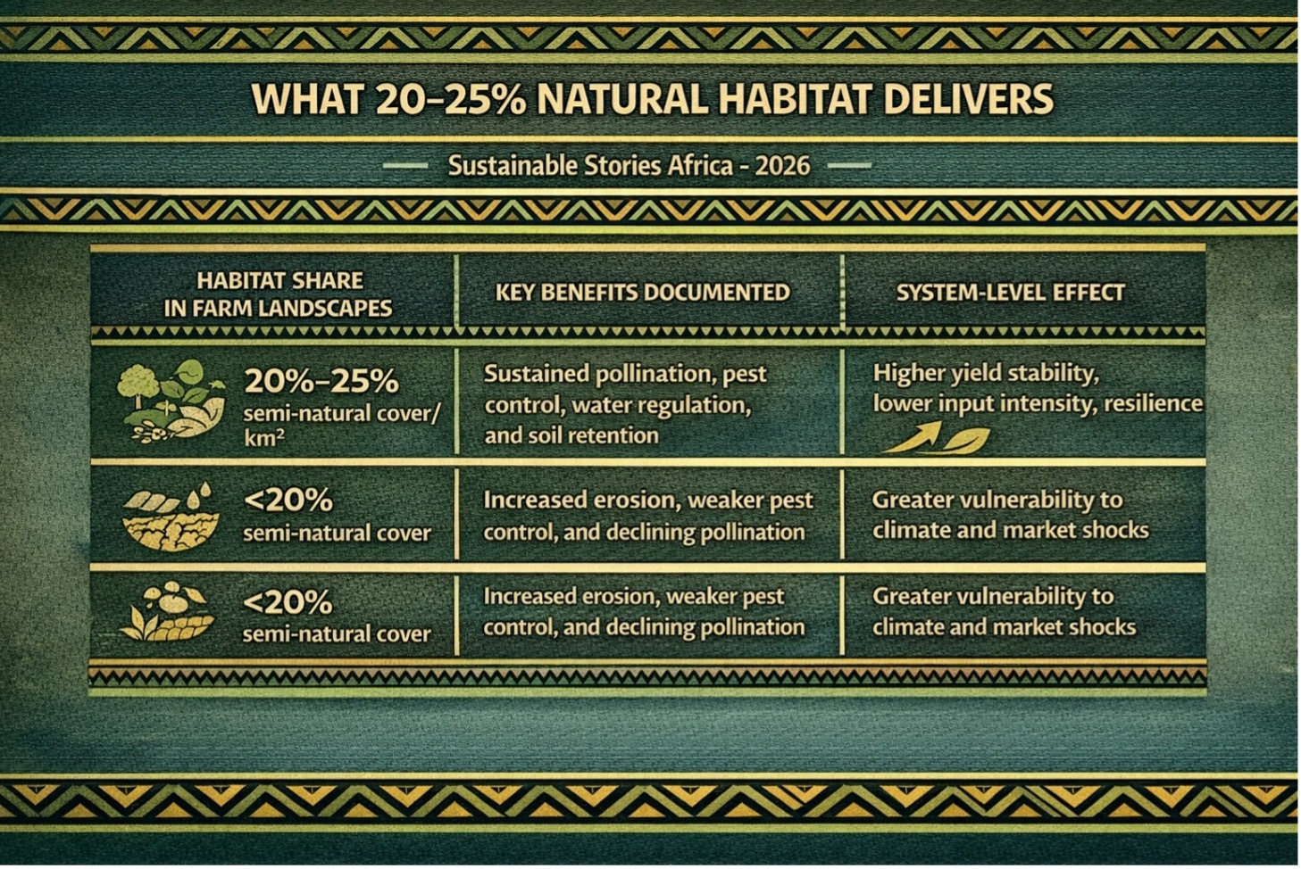 | <20% semi‑natural cover | Increased erosion, weaker pest control, and declining pollination | Greater vulnerability to climate and market shocks |