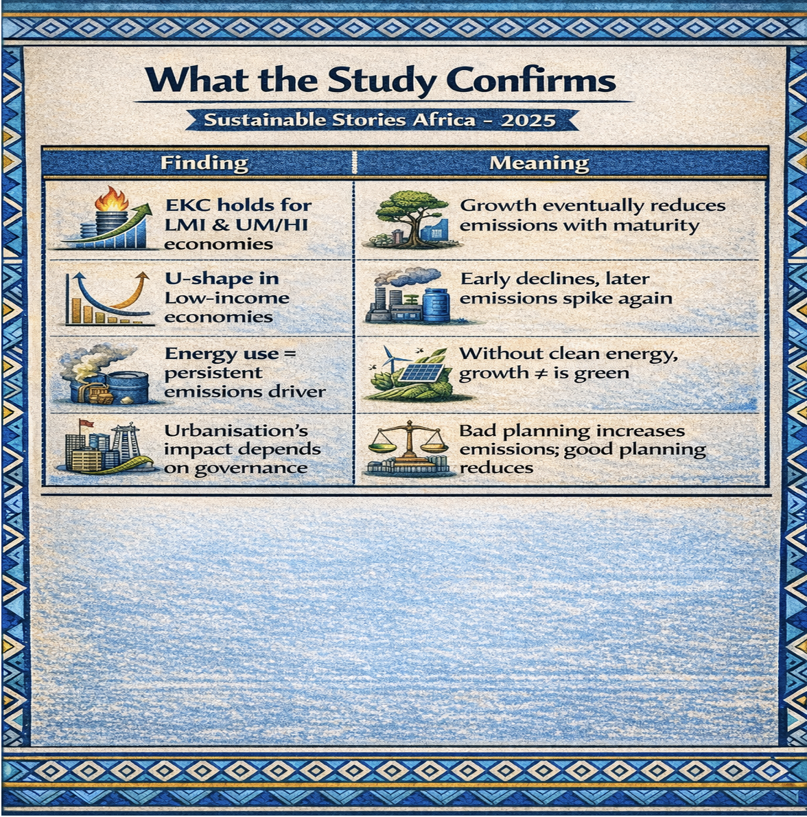 Africa must treat climate-economy evidence as strategy, not theory. The priority is accelerating nations across the EKC curve through clean energy, disciplined urban planning, institutional strength, and targeted investment.
