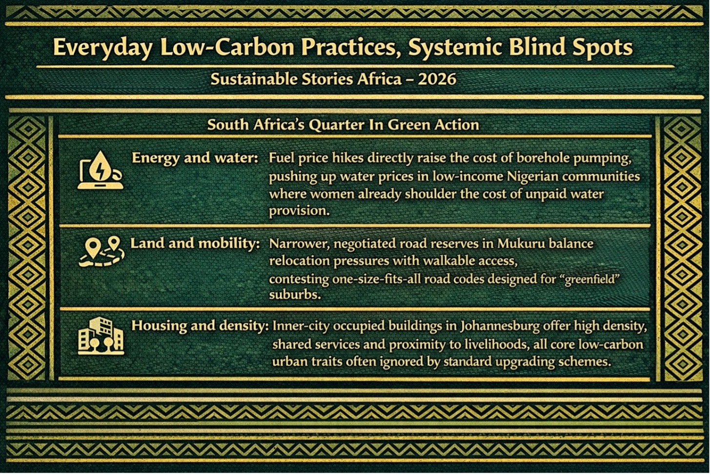 | Johannesburg | Inner‑city "occupied buildings" house marginalised groups near jobs. | Demolition bias wastes dense, serviced stock suited to low‑carbon living. |