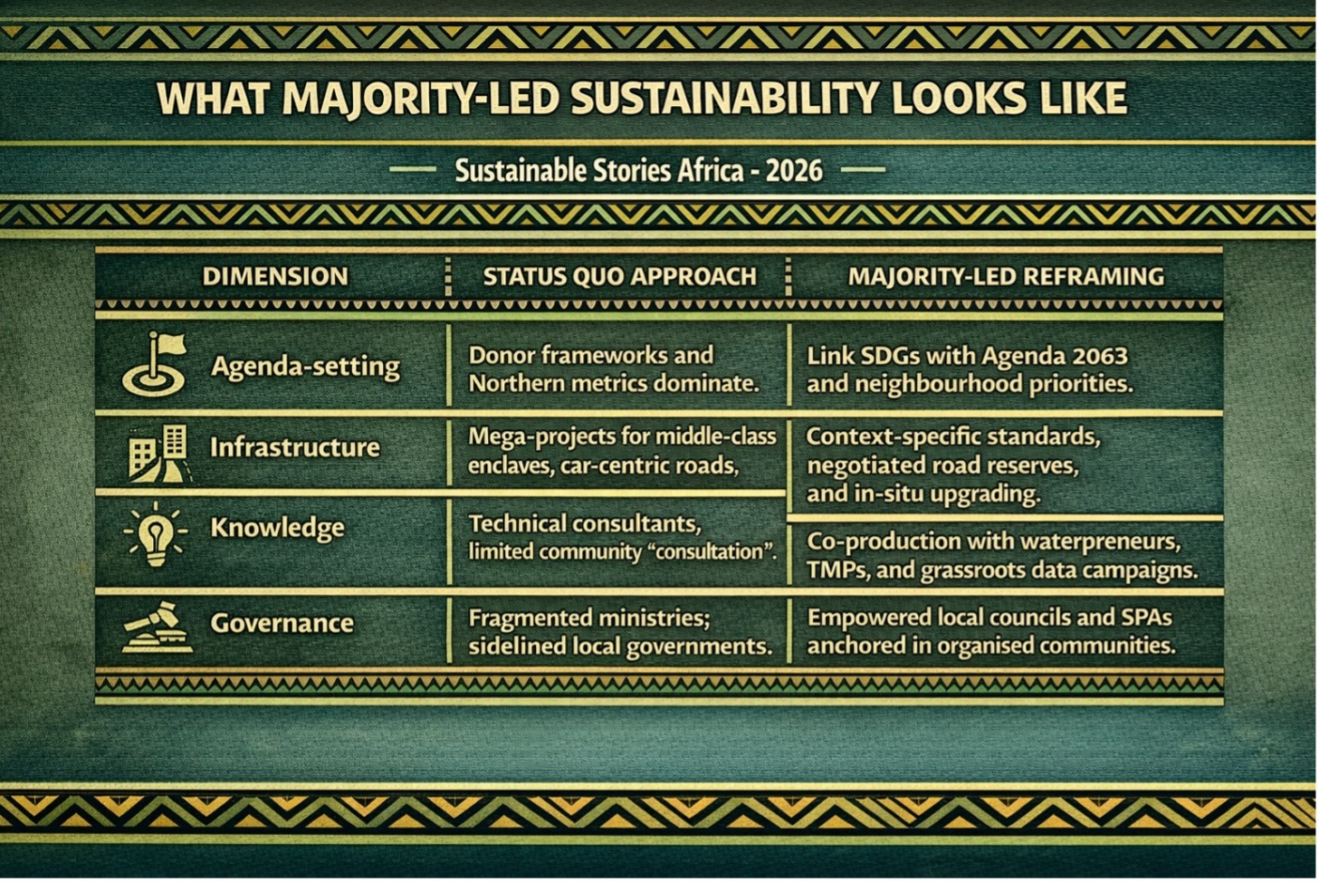 | Agenda‑setting | Donor frameworks and Northern metrics dominate. | Link SDGs with Agenda 2063 and neighbourhood priorities. |