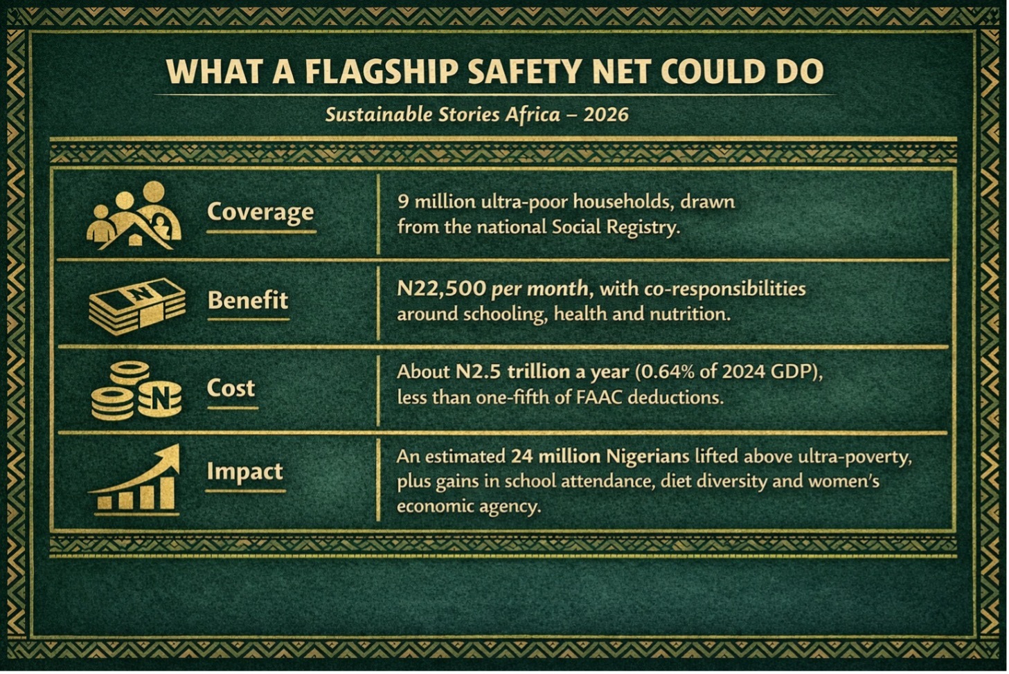 - Third, protection: Nigeria's social registry now covers some 86 million people across 19 million households, making it the largest database of poor and vulnerable households in Sub‑Saharan Africa. Used properly, it can move the country from ad‑hoc palliatives to predictable support. A basic safety‑net that pays N22,500 a month (around 20% of the ultra‑poverty line) to about 9 million ultra‑poor households would cost roughly 0.64% of GDP a year, around 19% of FAAC deductions in 2024, and could lift 24 million people out of ultra‑poverty.