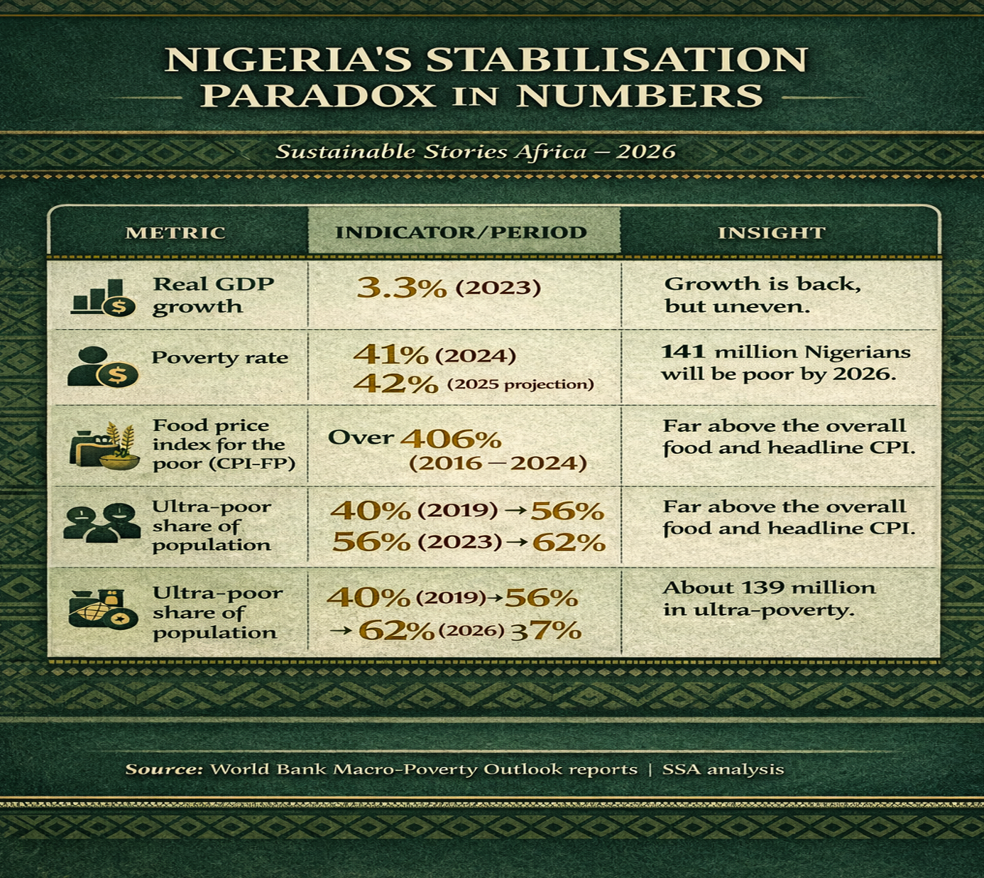 Poverty rate | 40% (2019) → 56% (2023) → 62% (2026 projection) | 141 million Nigerians will be poor by 2026. |