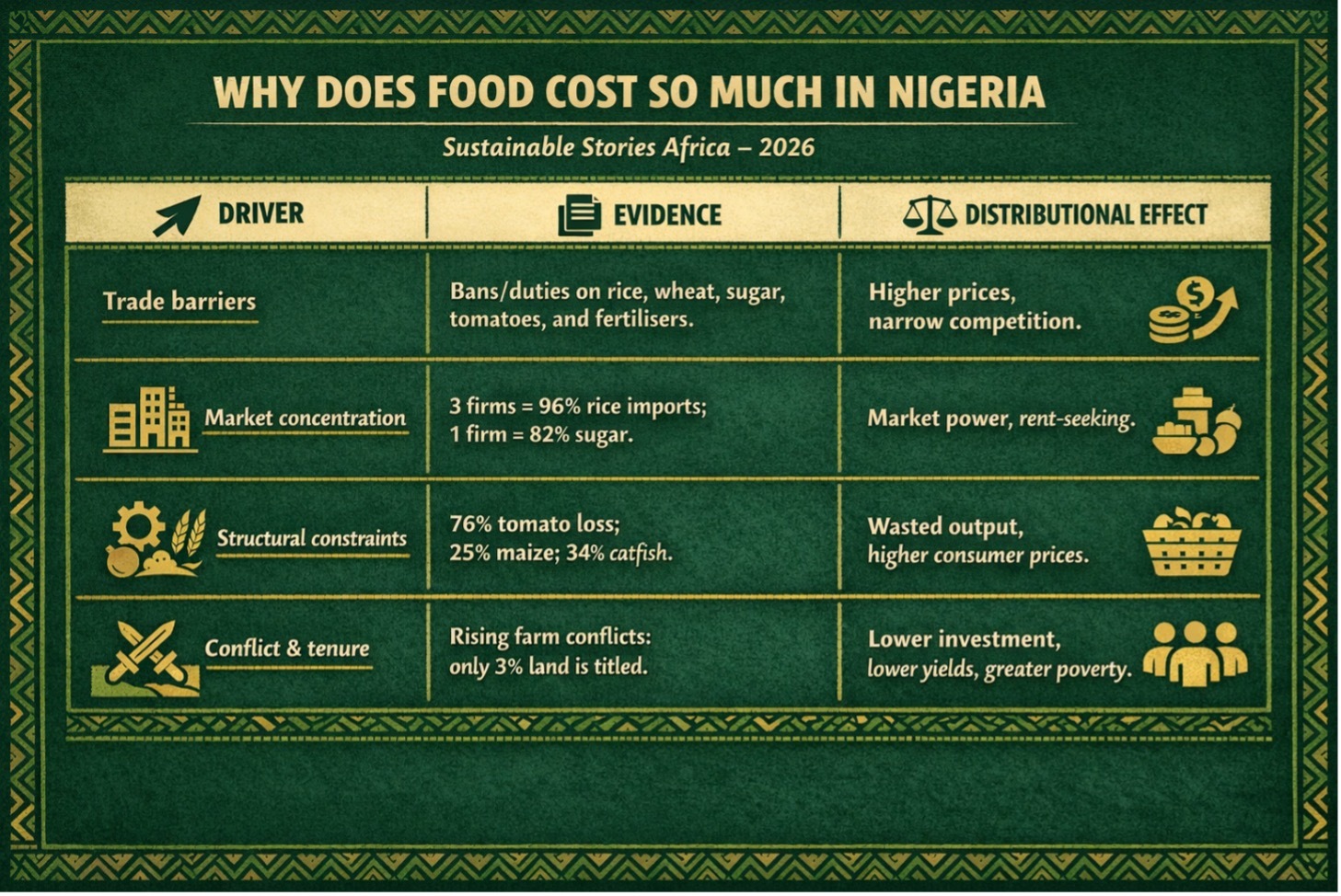 Inflation Bites Hardest Where States Are Weakest. The report's most uncomfortable insight is that Nigeria's food crisis is largely policy‑made. Import bans or steep duties cover staples like rice, wheat products, sugar, tomatoes, beverages, and even key inputs such as fertilisers and cement, raising production costs for smallholders and processors while entrenching a handful of waiver‑holding firms that dominate imports. In rice, three companies with waivers account for 96% of imports; for wheat, three firms handle 86%; for sugar, a single company controls 82%.