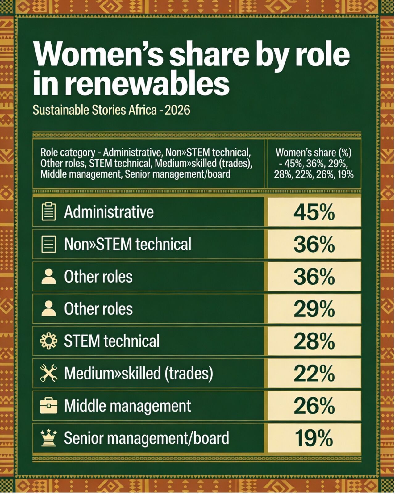 Inside renewables' silent glass ceilings. The report's disaggregated role data strips away the illusion that a 32% average signals equity. In administrative positions, women almost reach parity at 45%, and they hold 36% of non‑STEM technical jobs such as legal, policy or sustainability advisory roles.