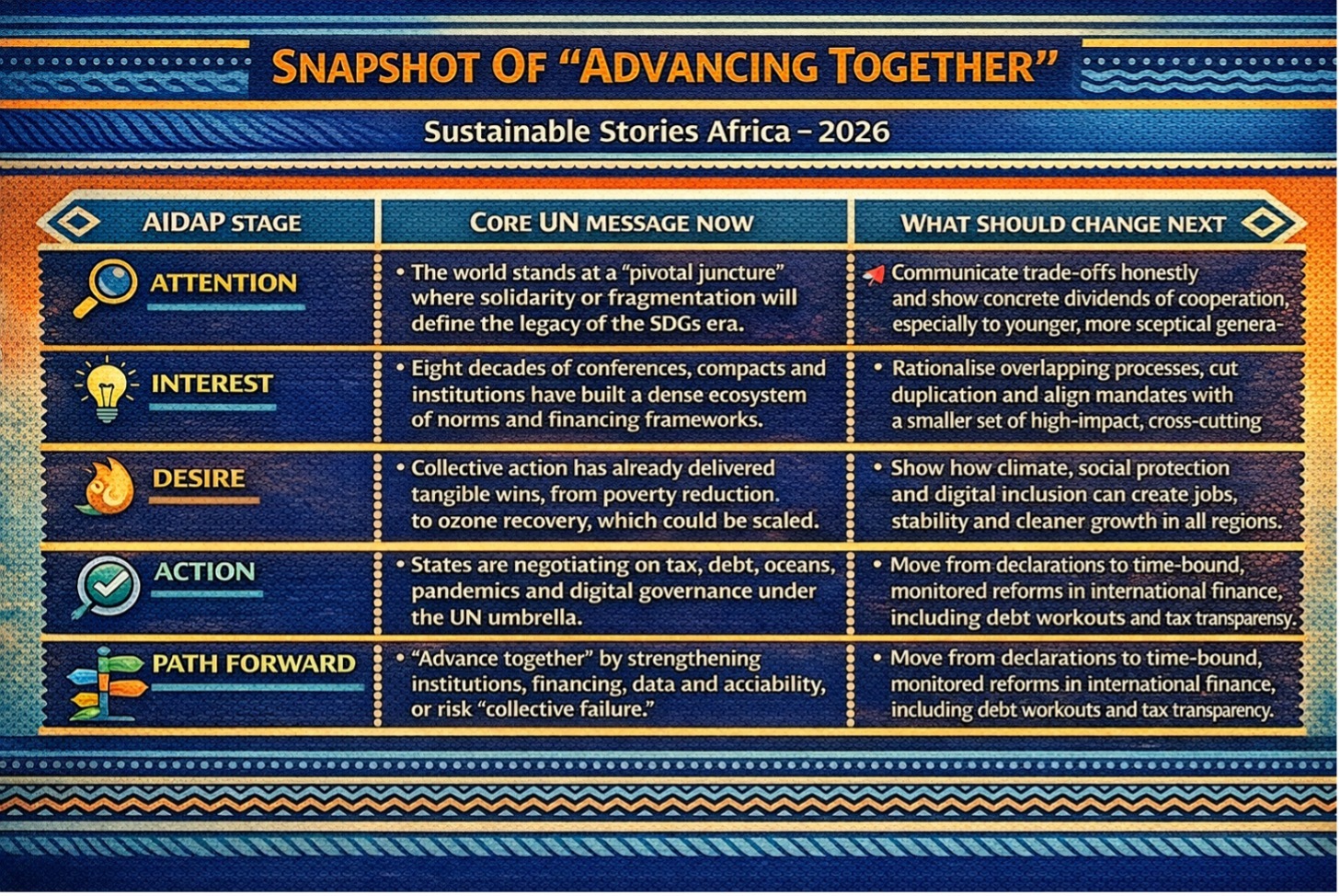 The report is clear that success will depend on more than resolutions. It calls for predictable financing, stronger analytical capacity, and domestic institutions able to translate lofty commitments into grounded local change—from city‑level SDG plans to inclusive social compacts that rebuild trust between citizens and the state.