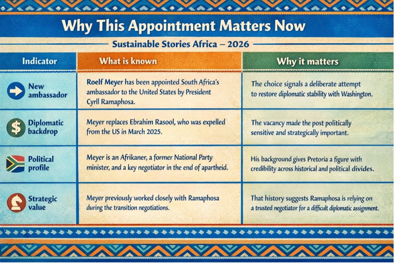 Roelf Meyer, the veteran apartheid-era negotiator who later became one of South Africa’s best-known bridge-builders, has been appointed the country’s ambassador to the United States, in a move that signals Pretoria’s attempt to steady strained ties with Washington.