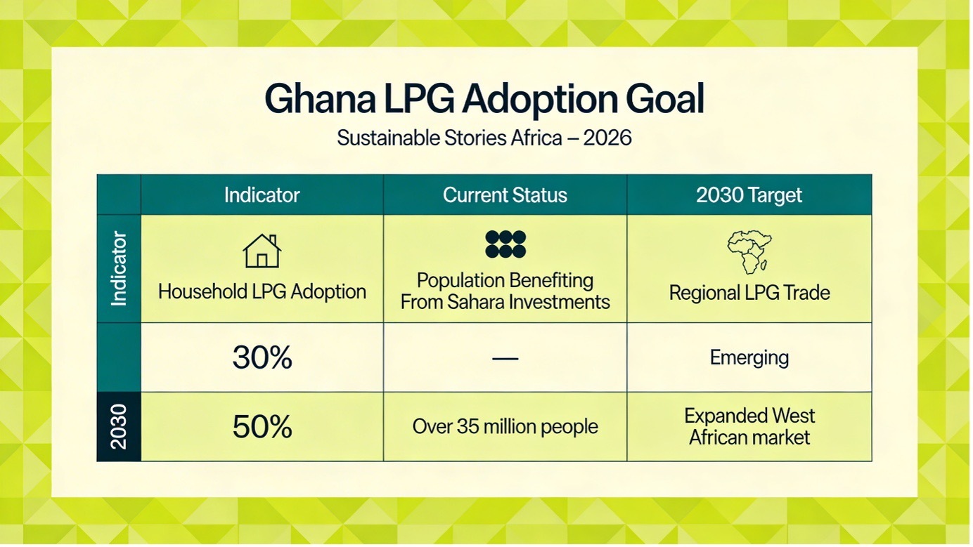 Ghana aims to increase LPG adoption to 50% of households by 2030, up from roughly 30% today, to reduce reliance on charcoal and firewood for cooking.