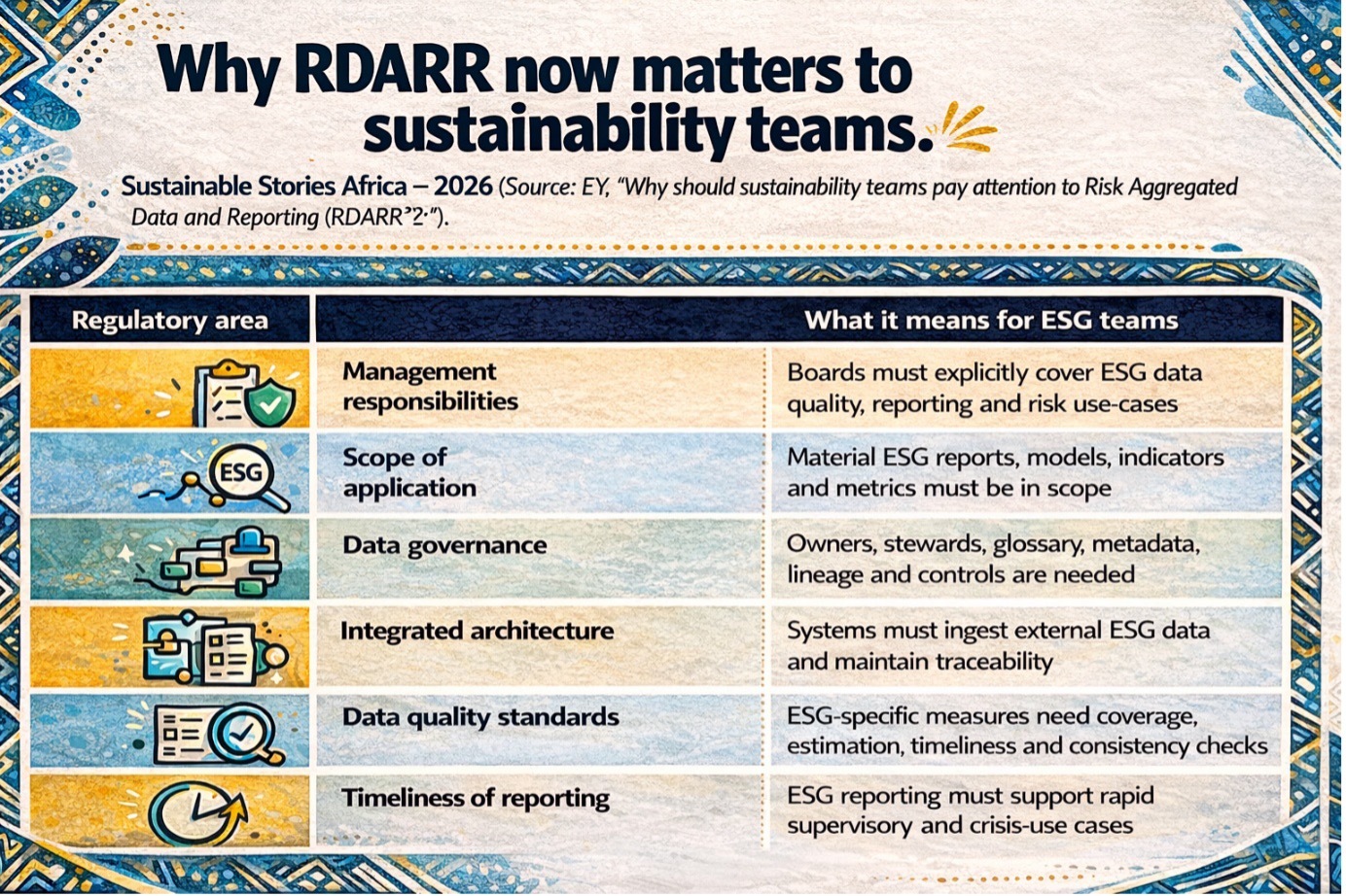 For years, many sustainability teams have focused on disclosure frameworks, climate targets, taxonomy alignment and assurance readiness. A March 2026 EY note makes a sharper argument: sustainability teams in banks now need to pay close attention to Risk Data Aggregation and Risk Reporting, or RDARR, and to BCBS239, the Basel framework that sets principles for risk data and reporting discipline.