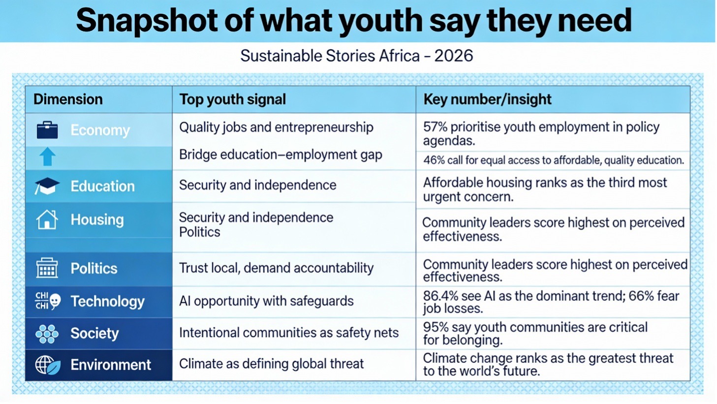 Through a Sustainable Stories Africa lens, Youth Pulse reads as a governance blueprint rather than a survey. Young people are demanding structural reform, embedded advisory roles, co-designed AI skills systems, and climate programmes that treat them as partners, not participants.